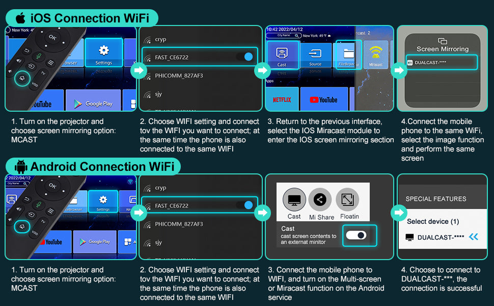The built-in Chromecast chip and the latest wireless module of the X1 smart projector are compatible and adaptive whether it is Android, iOS mobile devices, or Windows computers. WiFi Projector, Bluetooth Projector, HDMI Projector, USB Projector, and Android Projector All five projectors in one, this is a real multi-purpose portable smart projector.