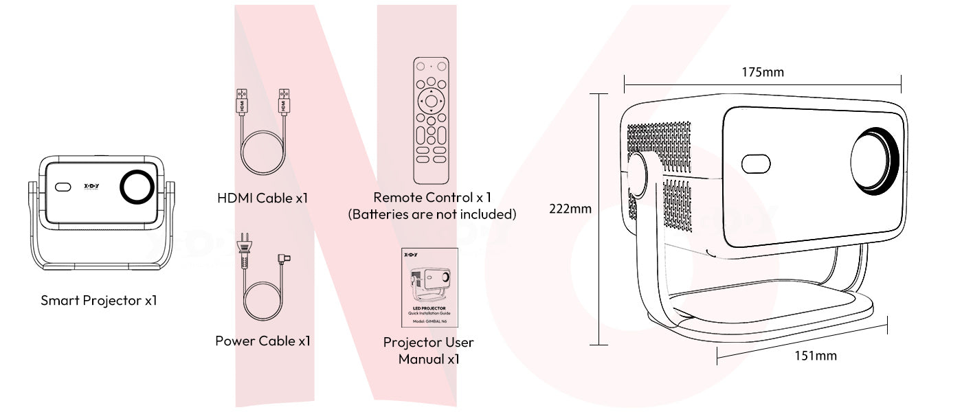 Smart Projector x1, HDMI Cable x1, Power Cable x1, Remote Control x 1(Batteries are not included), Projector User Manual x1