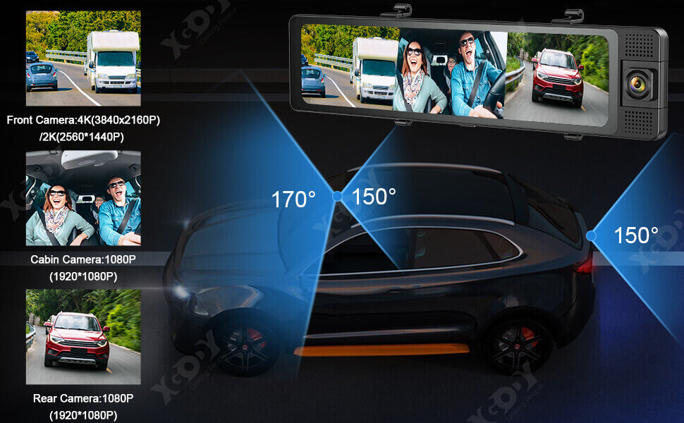 XGODY J406 Triple Channels Dash Cam - 12-Inch Touch Screen, 4K Ultra HD